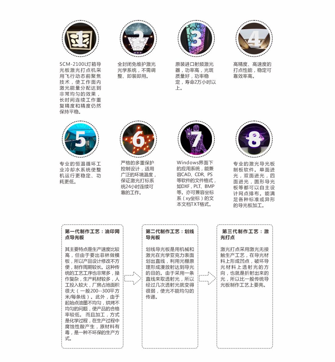 導光板激光加工設備,是三工光電長期專注市場需求,經(jīng)過多年技術攻關,凝聚最先進的激光打點技術開發(fā)而成。相比市面上普通的激光打點設備,激光設備采取射頻脈沖的方式,配備先進的軟件控制系統(tǒng),可在導光材料上形成任何圖形的精細凹點。