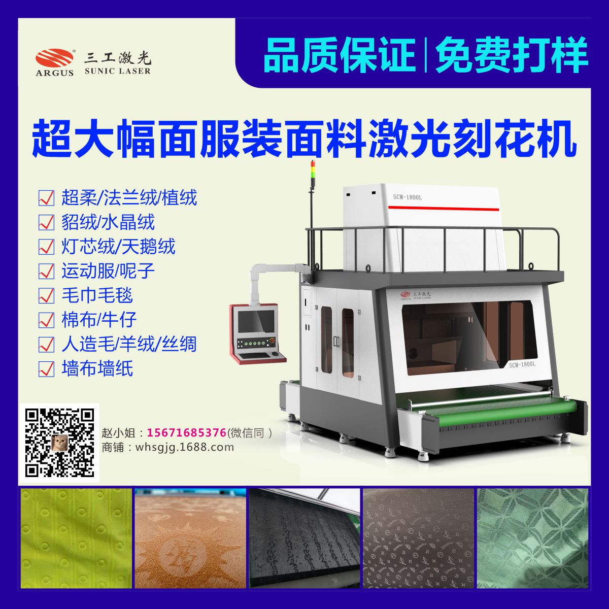 服裝激光燒花機(jī),選用原裝進(jìn)口激光器、動態(tài)聚焦系統(tǒng)。可在牛仔布上雕刻任意花紋,幅面600mm*600mm——2500mm*無限長可自由選擇。形成類似水洗效果,同時該設(shè)備還可兼容位圖,任何一張jpg圖片經(jīng)過少量加工后即可用于雕刻,相較于傳統(tǒng)工藝,該設(shè)備具有加工速度快、加工一致性好、無污染等特點(diǎn)。廣泛應(yīng)用于皮革、鞋料、牛仔、無紡布、布料等鐳射、燒花、雕刻、切割、打孔、打碼、噴碼等。