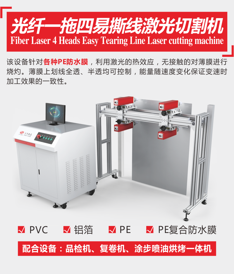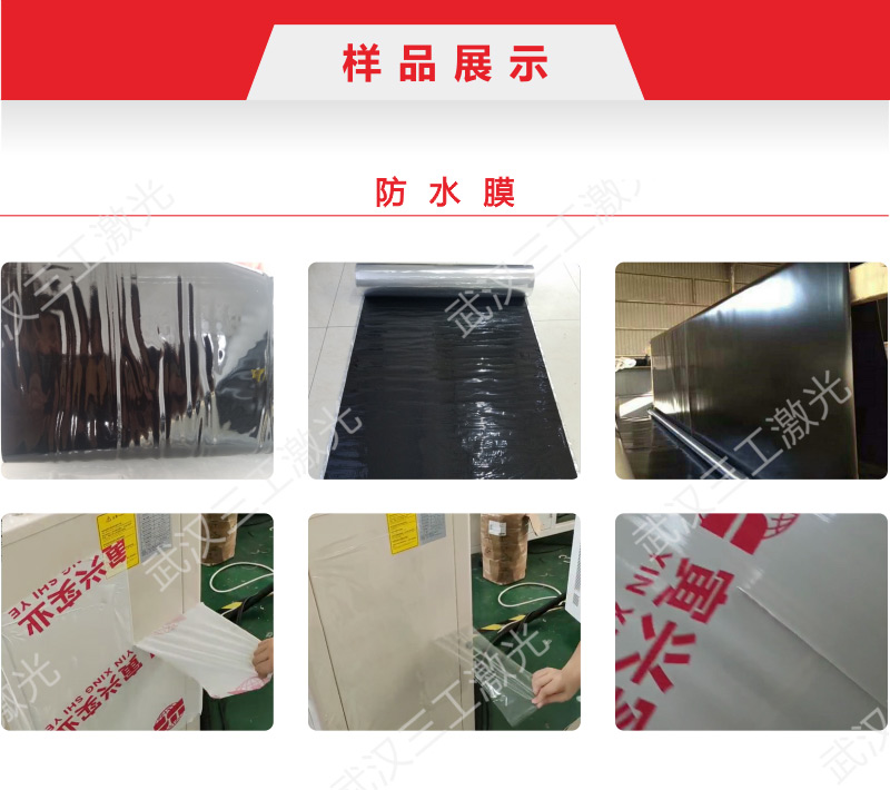 該設(shè)備針對各種PE防水膜,利用激光的熱效應(yīng),無接觸的對薄膜進行燒灼。薄膜上劃線全透、半透均可控制,能量隨速度變化保證變速時加工效果的一致性。